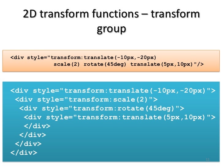 - 2D Skew: The last transform value in the group, skew, is used to distort elements on the horizontal axis, vertical axis, or both. The syntax is very similar to that of the scale and translate values. Using the skewX value distorts an element on the horizontal axis while the skewY value distorts an element on the vertical axis. To distort an element on both axes the skew value is used, declaring the x axis value first, followed by a comma, and then the y axis value.%p